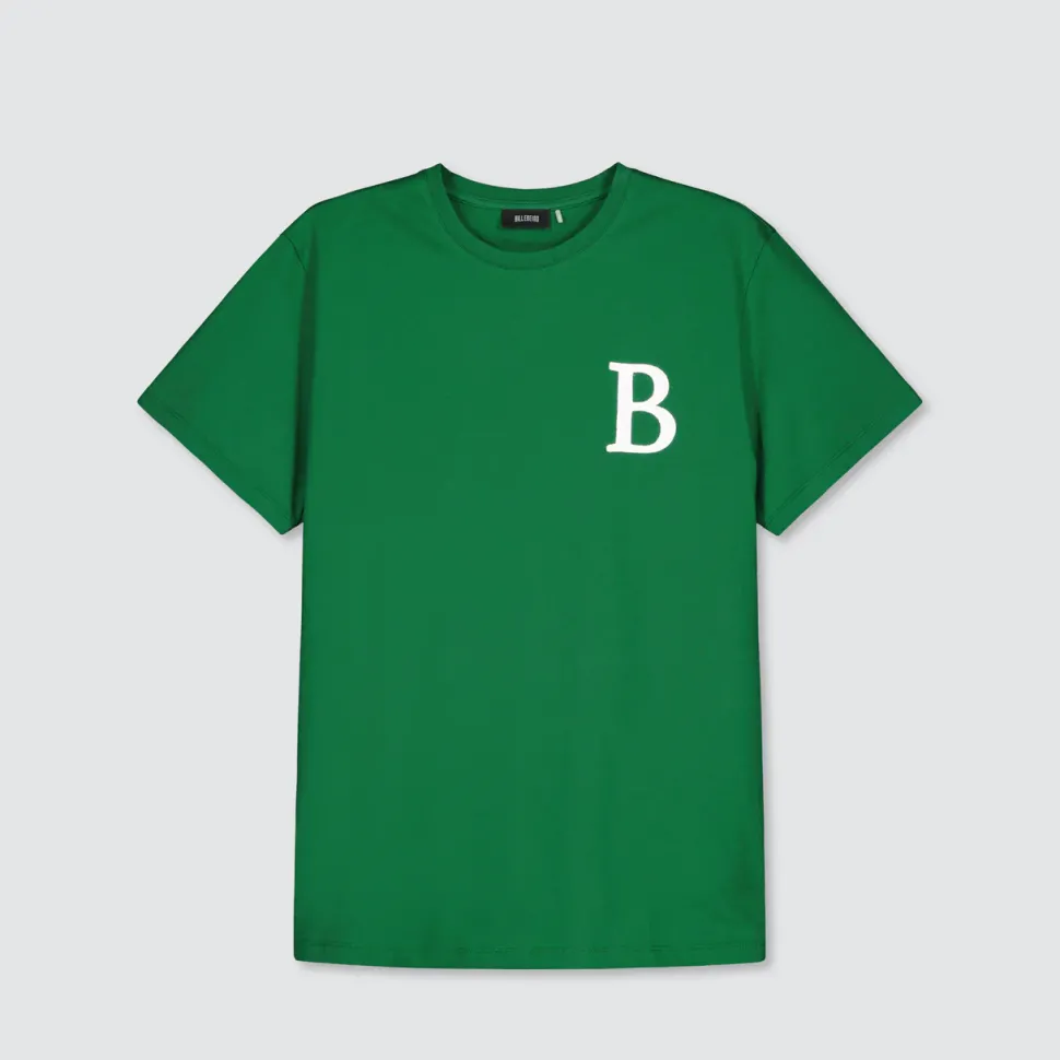 Vihreä Billebeino B logo t-paita luomupuuvillaa.
