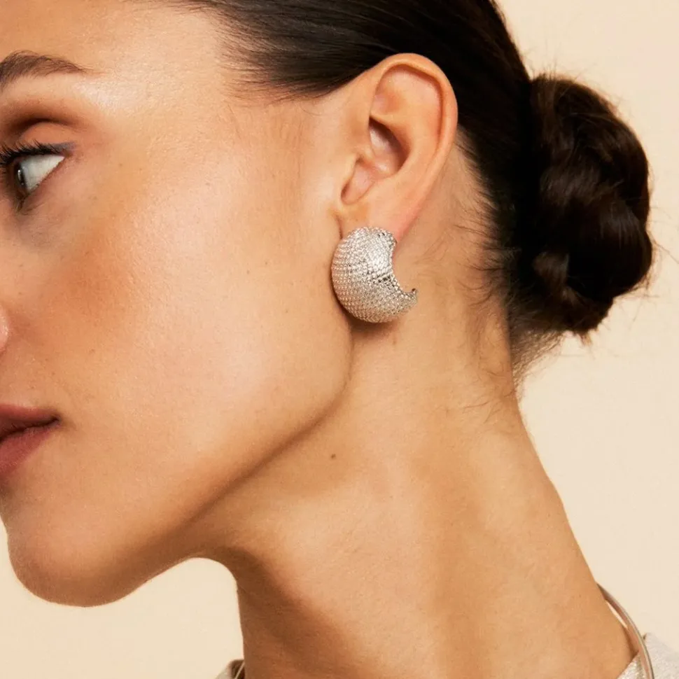 Edblad Amarillo korvakorut, joissa on trendikäs ketjurakenteellinen pinta ja pehmeät muodot, jotka tekevät siitä miellyttävän pitää. Tämä malli on rodiumpinnoitettua, kierrätettyä messinkiä.
