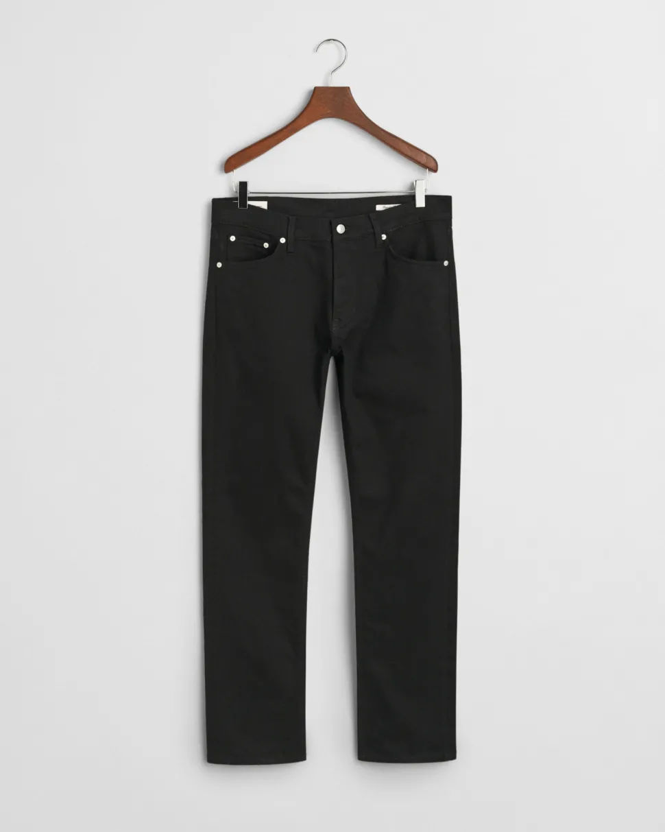 Pitkäkestoinen Stay Black ‑väri säilyy haalistumattomana monien käyttö- ja pesukertojen ajan. Regular fit ‑mitoitetuissa farkuissa on normaali vyötärö, kapea lantio ja normaali mitoitus lahkeissa. Farkuissa on klassinen viisitaskumalli, GANT-varsinapit ja -niitit, vetoketjusepalus ja takana vyötäröllä nahkainen logomerkki.