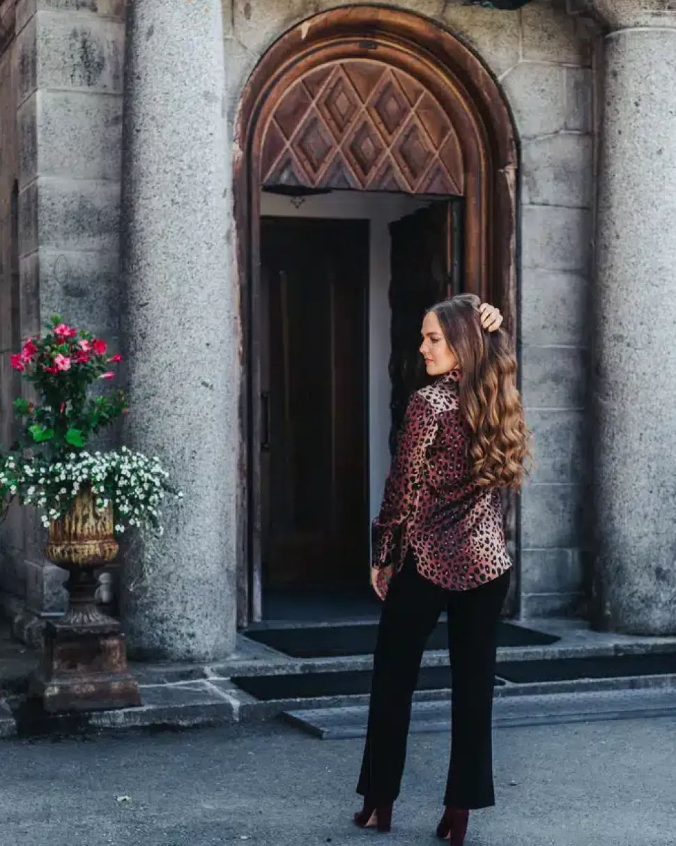 Silkkimäinen Nakoa leopardipusero. Rypistymätön materiaali. Klassinen paitapuseromalli.