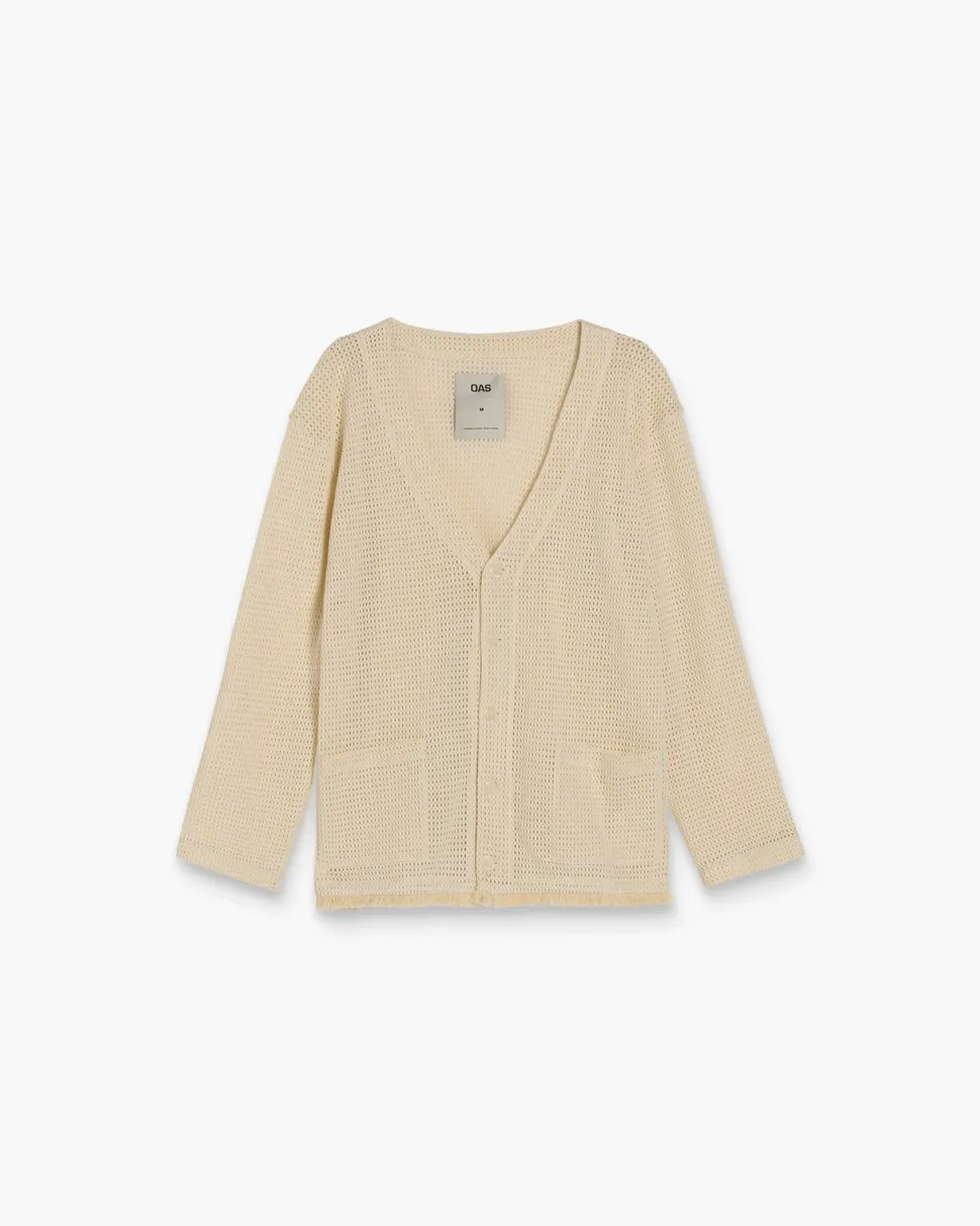 Rento OAS neuletakki valkaisematonta puuvillaa. Rentoa verkkoneulosya. Napitus.