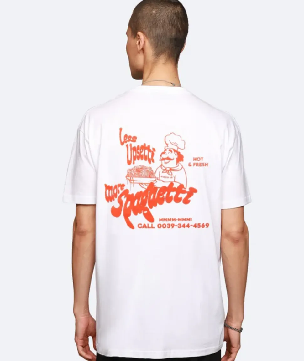Suuri ‘More Spaghetti – Less Upsetti’ printti selässä