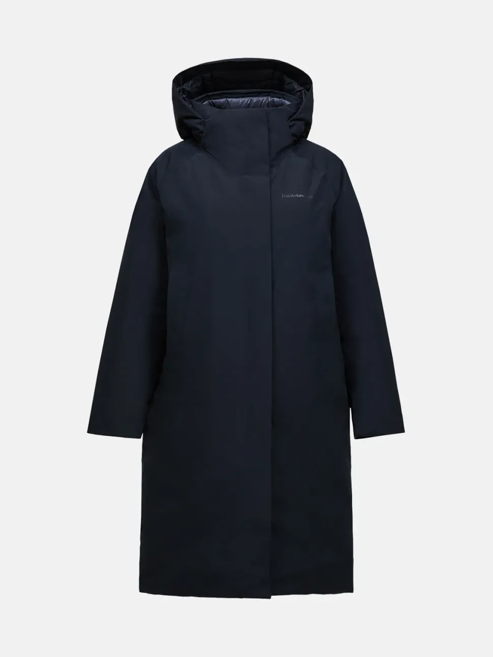 Pitkä, tekninen Peak Performance Treeline- untuvatakki.