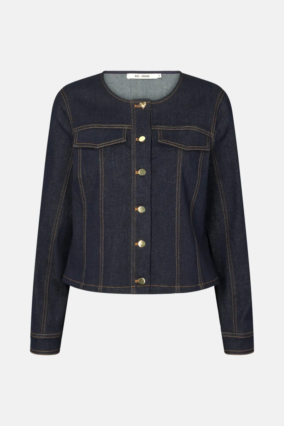 Naisellinen Rue de Femmen farkkujakku kultanapein.