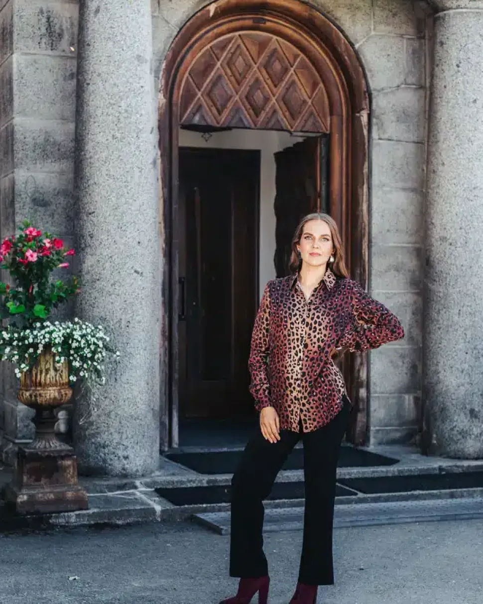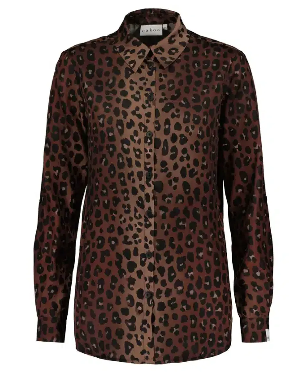 Silkkimäinen Nakoa leopardipusero. Rypistymätön materiaali. Klassinen paitapuseromalli.