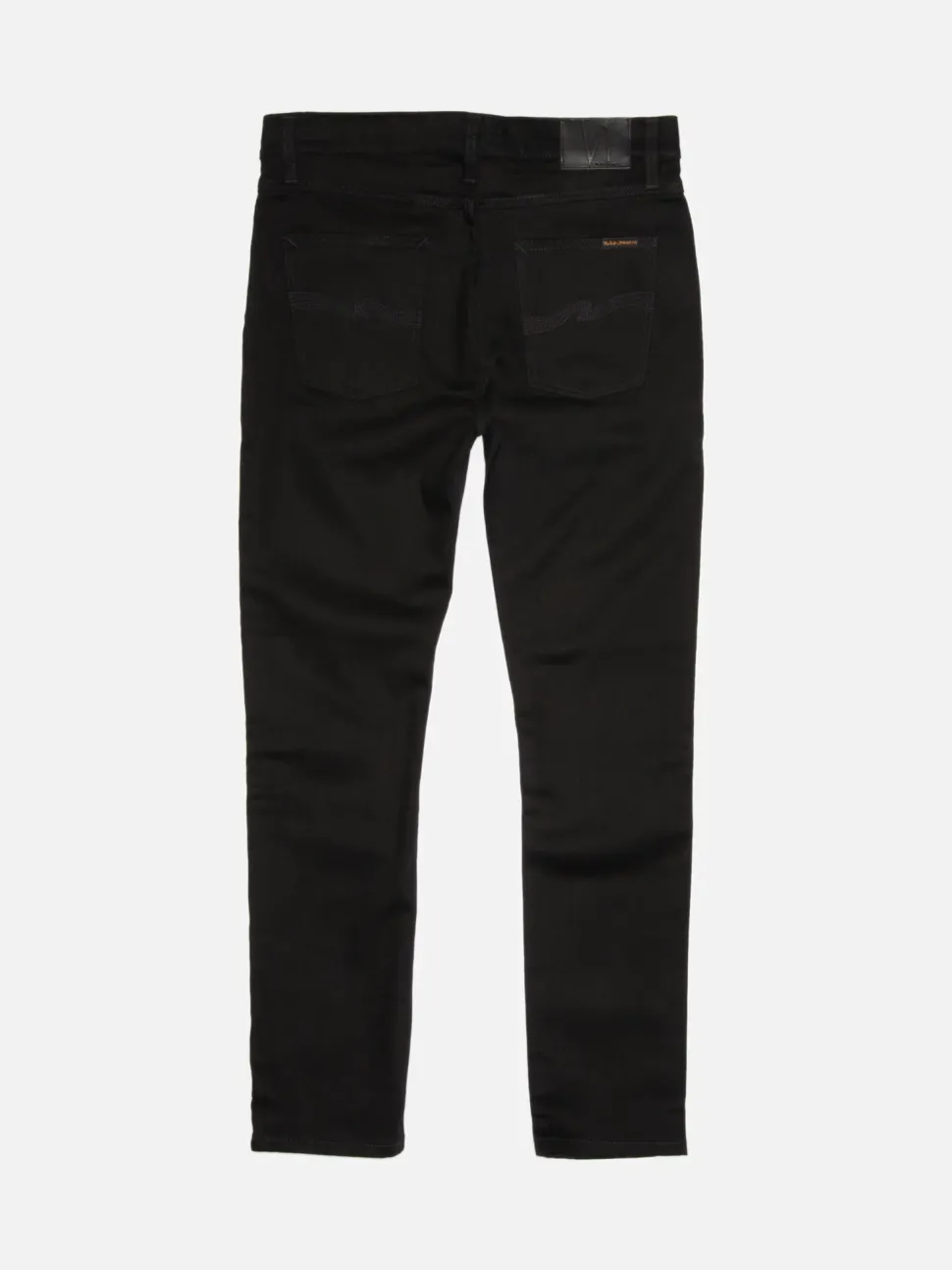 Mustat Nudie Jeans slim-fit tapered farkut. Musta joka pysyy mustana.